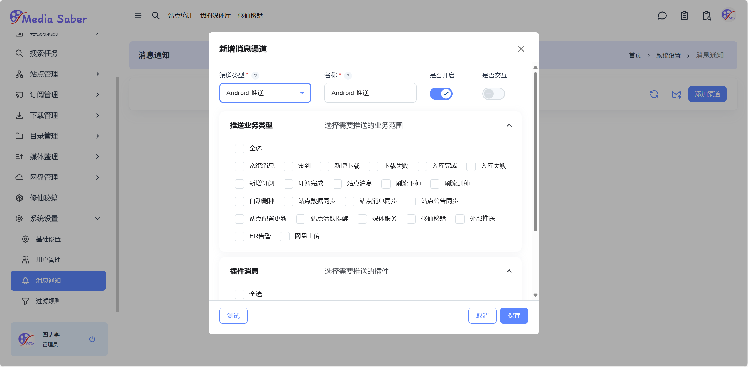 在系统设置-消息通知-添加渠道(Android or iOS)的消息渠道。