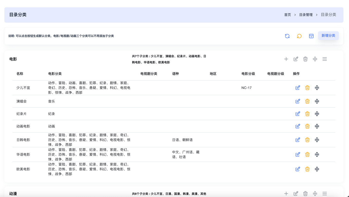 - 分别绑定电影 / 电视剧 / 动漫分类