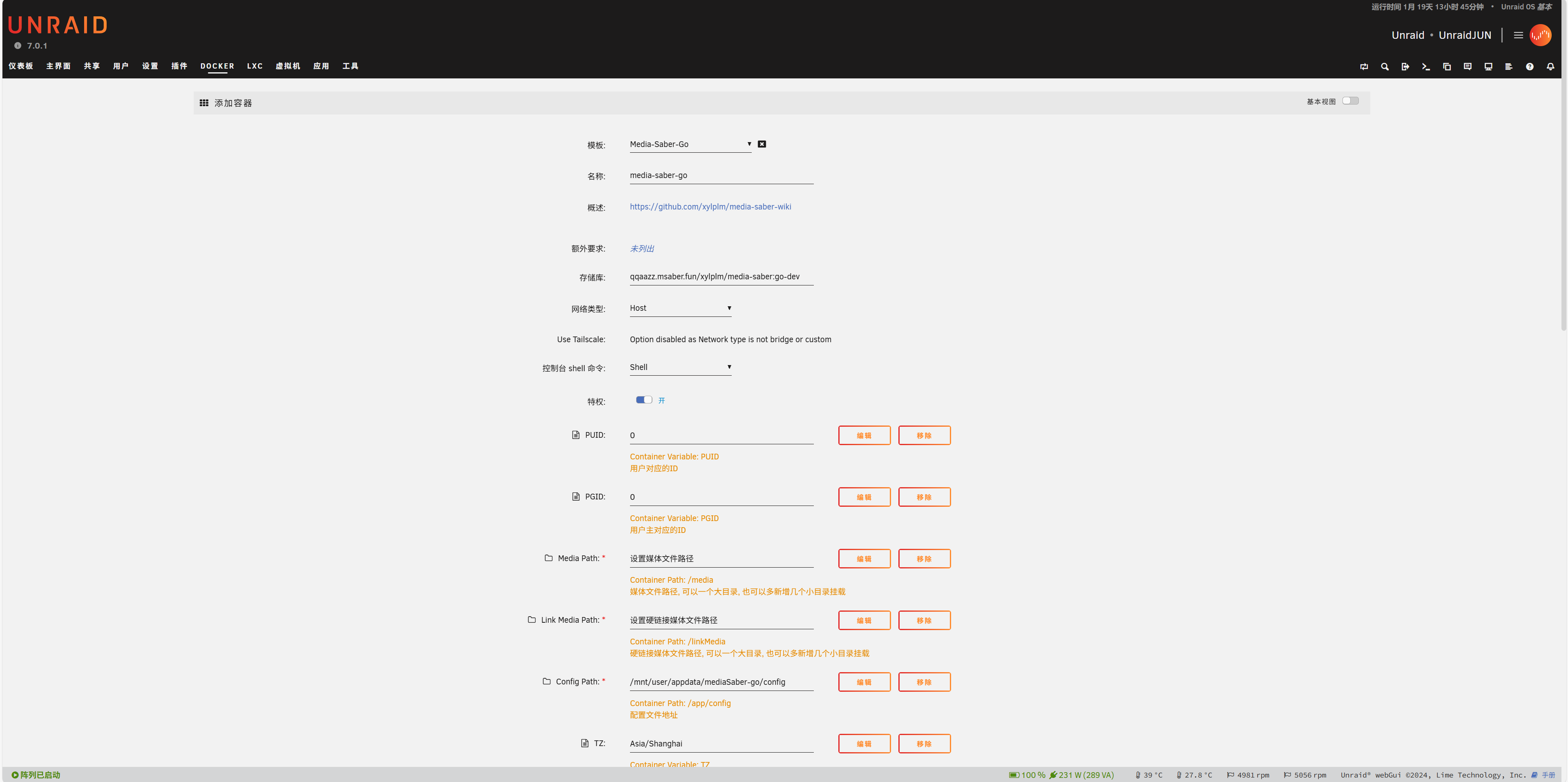 | Config Path | /mnt/user/appdata/mediaSaber-go/config | 配置文件存储路径 |