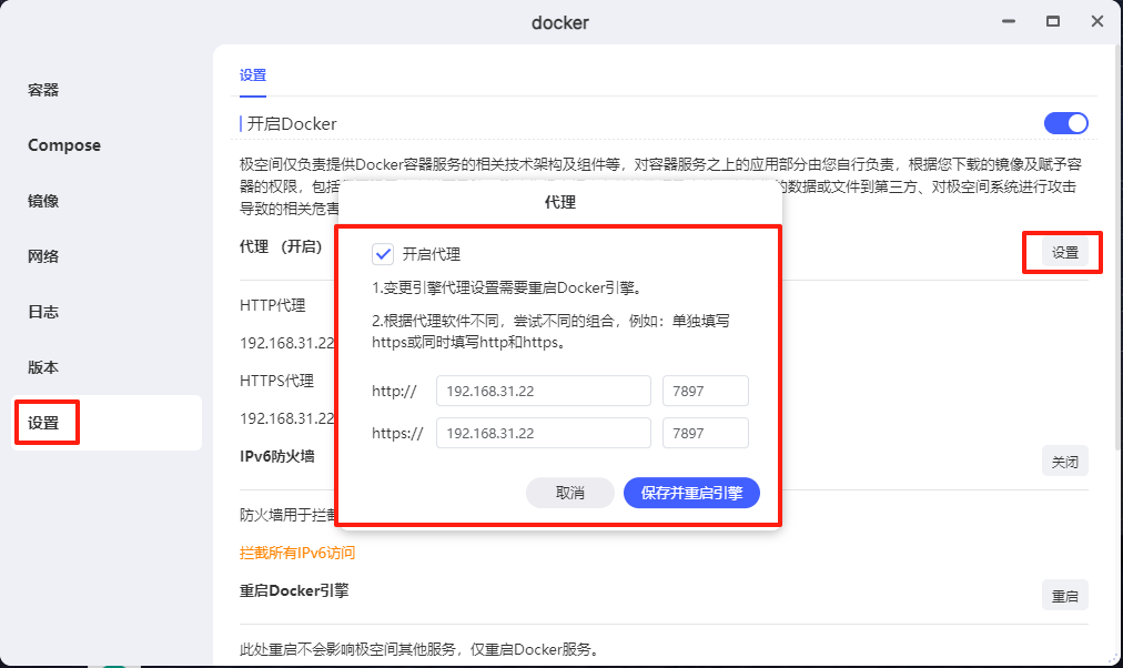 确保 Docker 能正常拉取镜像。在极空间 Docker 设置中配置代理地址: