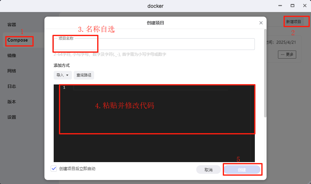 进入 Docker → Compose 菜单,点击右上角 新增项目