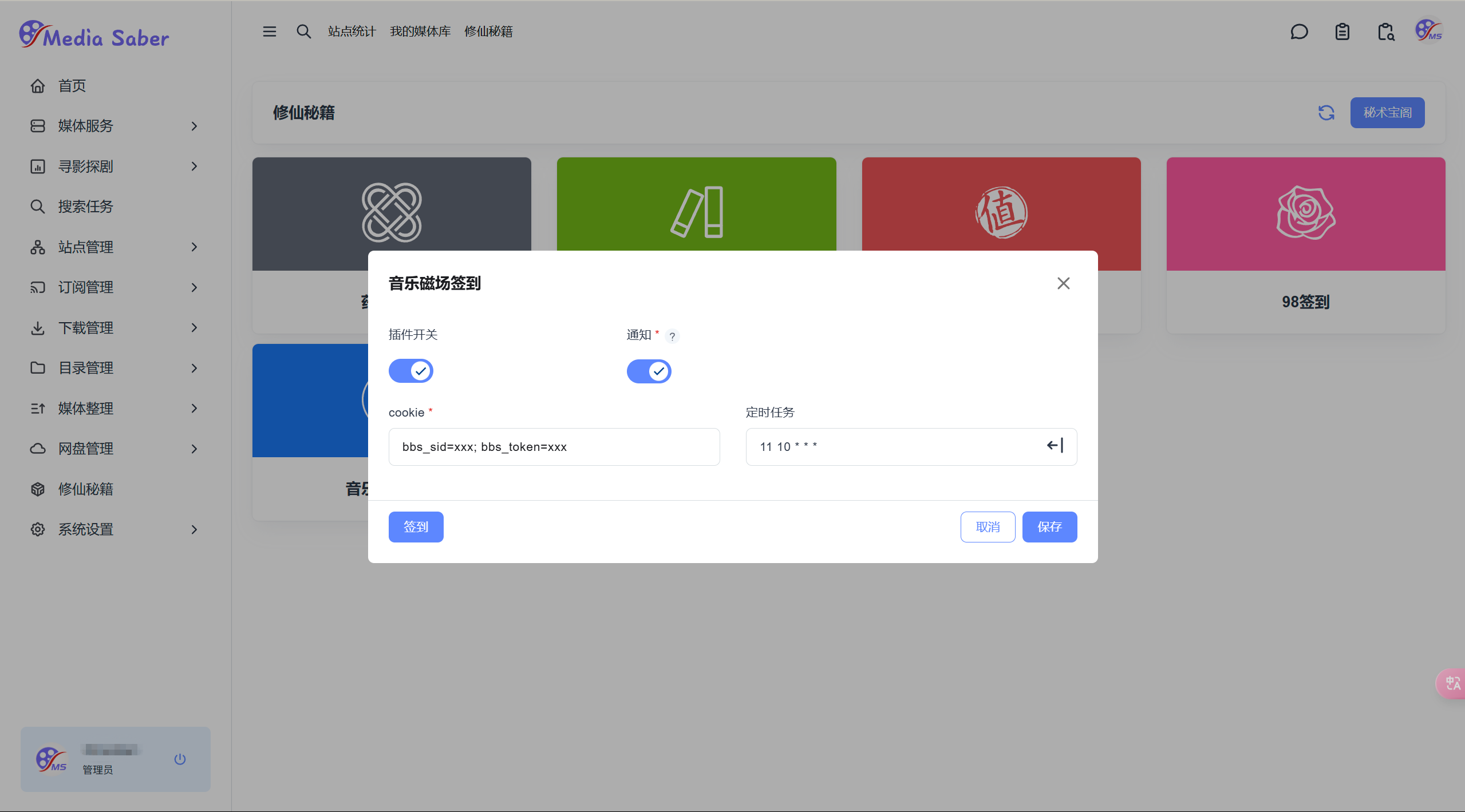 路径:修仙秘籍 → 插件管理 → 安装并启动"音乐磁场签到"插件